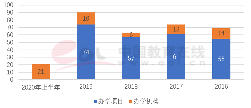 2019年至2020年上半年,共批準本科及以上中外合作辦學機構37個,中外合作辦學項目74個,將于2020年進行第一批招生。