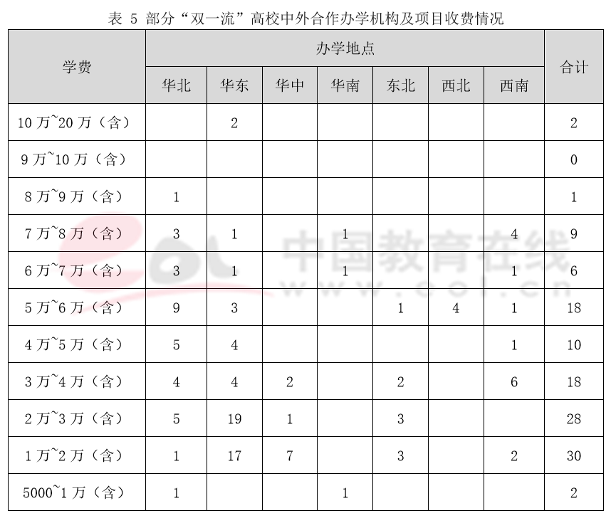 從中外合作辦學項目分配區域來看,華北、華東區域中外合作辦學項目學費相對較高。從合作院校及專業上看,國外院校排名靠前的學費較高、新型熱門專業學費較高。