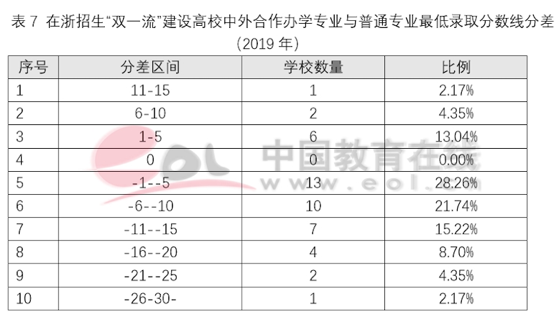 由于中外合作辦學項目或機構收費相對高昂,在招生的錄取分數上,多數中外合作辦學項目錄取分數線都低于非中外合作辦學項目。但差距在逐漸縮小,以浙江省為例,2019年在浙江招生的“雙一流”建設高校中共有46所有中外合作辦學招生專業(中外合作辦學機構和項目專業,不含獨立法人機構),專業最低錄取分數線和普通專業最低錄取分數線差值為-30到12分之間,超過普通專業錄取分數線的共有9所高校,占總數的20%,主要集中在華東和北京地區;有50%的高校合作辦學專業最低錄取分低于普通專業10分以內。專業錄取分差最大的兩所高校,分別是人民大學蘇州校區和北京交通大學威海校區,主要原因是辦學項目不在北京主校區,而在江蘇蘇州和山東威海。說明考生和家長報考時除了考慮學費問題還會關注校區問題。