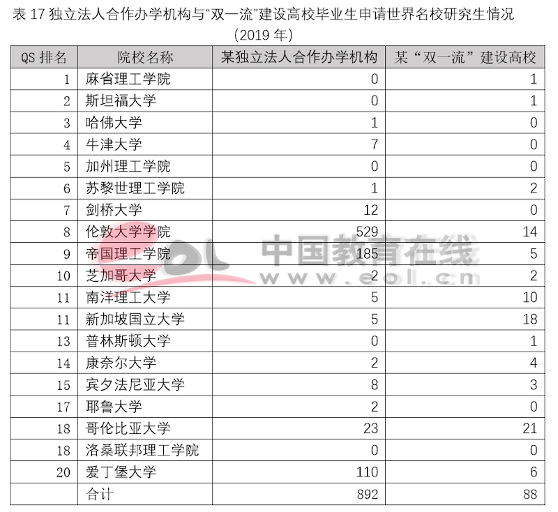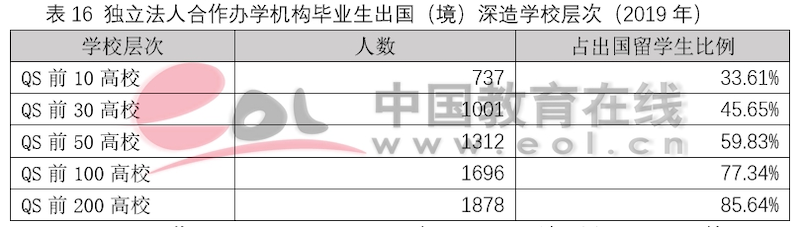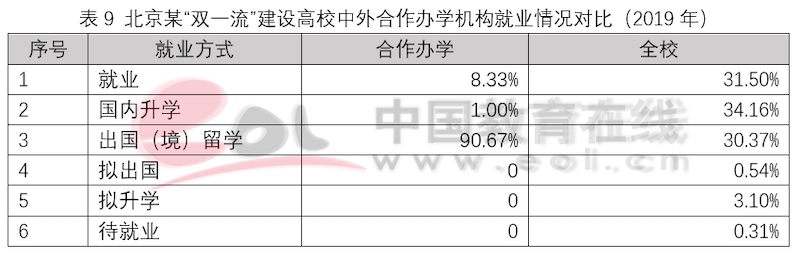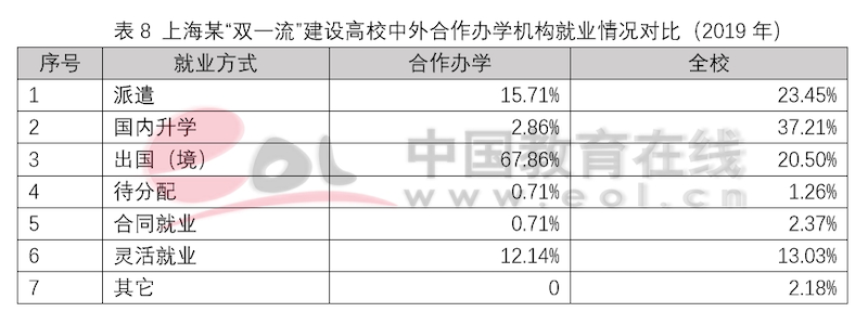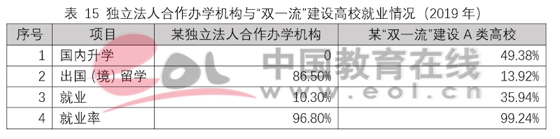 獨立法人中外合作辦學機構設立之初的目標就是引入優質國際教育資源,高水平示范性發展,培養高質量國際化人才。和非獨立法人中外合作辦學機構與項目一樣,獨立法人合作辦學機構畢業生在出國深造上具有顯著優勢。以2019年某獨立法人合作辦學機構和某“雙一流”建設A類高校2019年就業和出國深造數據為例,可以看出,獨立法人合作辦學機構的畢業生選擇出國(境)深造的比例要遠高于普通高校,并且在申請海外名校深造時更受青睞。