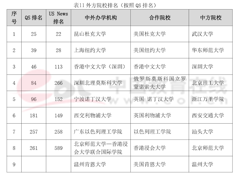 這9所獨立法人中外合作辦學機構外方合作院校均是國際知名大學,除溫州肯恩大學外,其余8所外方合作院校QS排名均在300名以內。