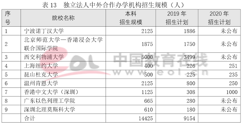 經教育部審批,9所獨立法人合作辦學機構每期本科招生規模為14425人,2019年高考統一招生計劃人數為9154人(未含國際及港澳臺學生),2020年4所已公布招生計劃的獨立法人合作辦學機構招生人數都有小幅上漲。