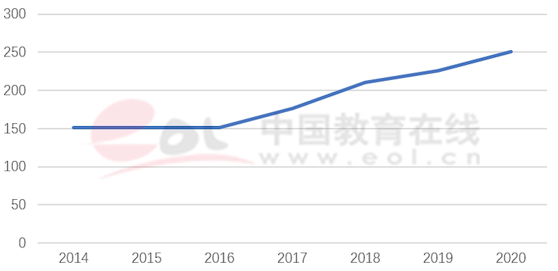為了保證辦學質量,各中外合作辦學機構首年招生人數都小于審批的招生規模,隨著辦學的成熟,逐年增加。如圖所示上海紐約大學招生人數從2014年的151人,增加到了2020年的251人(未含國際及港澳臺學生)。