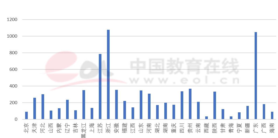 中外合作辦學項目和機構總體招生規模較小,各省分布差異較大,本科階段招生較多的省份主要為華中地區的河南、湖北、華東地區的山東、江蘇、上海以及東北地區的吉林、黑龍江。其中“雙一流”建設高校中外合作辦學項目和機構招生計劃人數最多的省份依次為河南、山東均超過1000人;招生計劃人數超過600人的有江蘇、河北、北京、安徽、湖北、四川;最少的省份主要集中在西南和西北,依次為西藏、青海、寧夏、海南和甘肅。