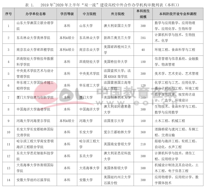1.2019年~2020年上半年“雙一流”建設高校中外合作辦學機構審批列表(本科)