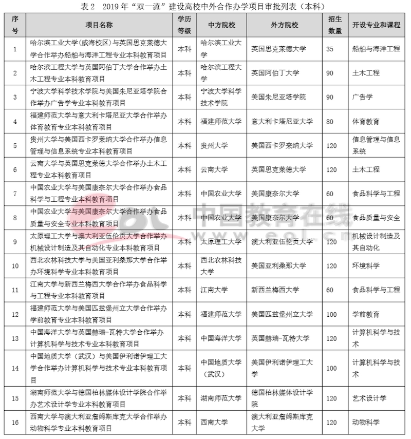 2.2019年“雙一流”建設高校中外合作辦學項目審批列表(本科))
