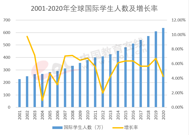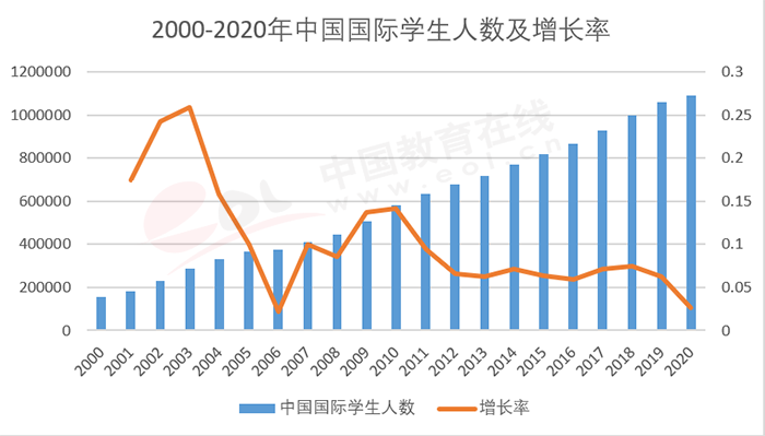 根據聯合國教科文組織統計研究所數據,2000-2020年度,中國在海外高等教育機構學習的國際學生數量總體呈上升趨勢,僅在2003年略有下降。自2012年以后,增長幅度趨緩,2020年受新冠疫情影響,增長率下降到2.68%(見圖6)。