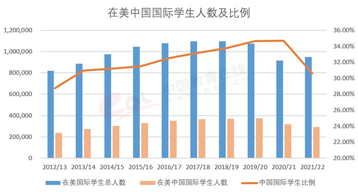 自2009年后,中國一直是美國國際學生最大生源國,2012年之后,中國留學生占美國國際學生總數一直在30%以上。據剛剛發布的《2022年美國門戶開放報告》顯示,2021/22在美國接受高等教育的國際學生人數為948,519,同比增長3.8%。其中,中國國際學生人數為290,086名,雖然仍位居第一位,但已經連續兩年快速下降,占比也從上一年度最高的34.7%下降至30.6%(見圖8)。