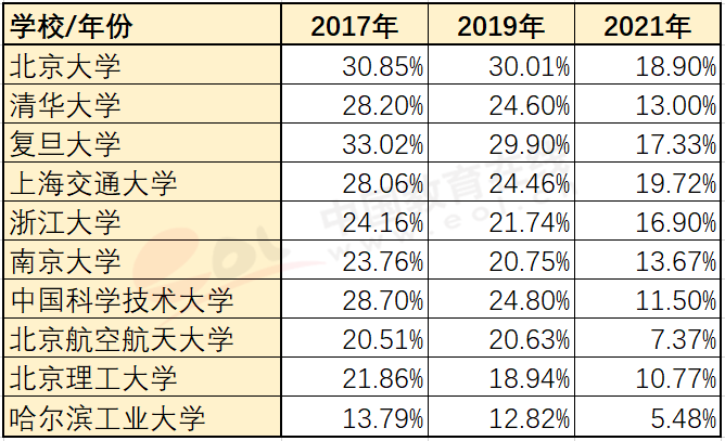 對于原因,門戶開放報告負責人分析主要是因為疫情影響出國,但美國高校認為是10043號總體令等政策限制問題,即對中國赴美國際學生就讀敏感專業等進行一系列的簽證限制,但美國務院否定了這一說法,認為受這一政策影響的不足2%。其實美國的限制還是很明顯的,中國一些頂尖綜合類和理工類高校本科畢業生,出國留學人數已經出現大幅下降,甚至腰斬(見表3)。