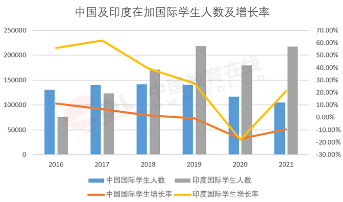 加拿大國際學生的主要來源地是亞洲國家,近幾年排名前兩位的一直是中國和印度,占到總人數的50%以上。2017年以前,中國是加拿大最大的國際學生生源國,但增長速度放緩,接近停滯。而印度赴加留學人數迅猛增長,并在2018年超越中國,成為第一大生源國(見圖10)。2020年,因為疫情原因,加拿大國際學生人數相比2019年腰斬,不過中國和印度國際學生人數下降比例不到20%,主要減少的為歐洲國家生源。