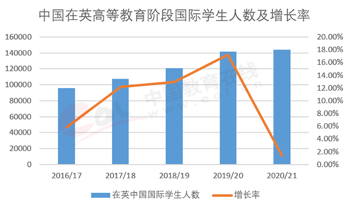 英國高等教育統計局(HESA)的數據也顯示,英國對中國國際學生的吸引力在持續上升,中國在英國高等教育階段學習的國際學生人數從2016/17學年的9.5萬人上漲到2020/21學年的14.4萬人,增加了接近5萬人,并且在疫情下的2020/21學年也保持了增長(見圖11)。