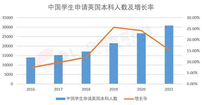 據英國大學招生服務中心(UCAS)統計,2017年后,申請就讀英國大學本科的中國國際學生一直保持兩位數增長,2021年申請人數進一步上升,首次超過3萬,超過了歐盟國家整體申請人數之和(見圖12)。由于中國學生申請人數增加過于迅猛,申請競爭更加激烈,尤其是名校的申請難度增大。