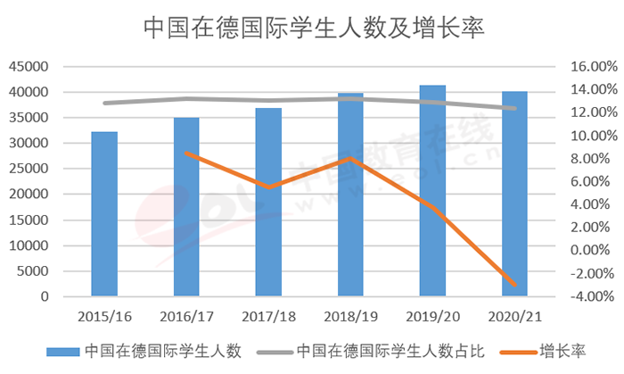 由于德國公立大學免費入讀,加之自2020年起德國所有的高等院校可接受中國會考和高考的成績,中國學生高中畢業后可直接申請德國的本科,因此越來越受到中國留學生的青睞。根據德國學術交流中心(DAAD)數據顯示,中國近年來一直是德國國際學生最大生源國,占比始終保持在12%-14%之間。即使在疫情期間,中國在德國際學生人數也基本保持穩定,沒有出現大幅下降。