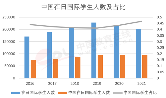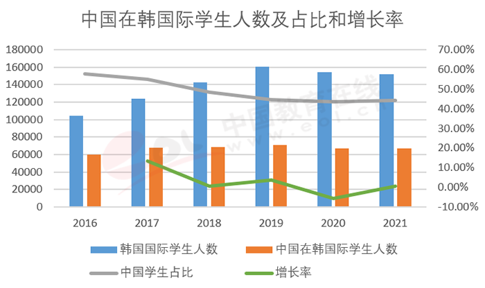 由于學費低廉,地理位置接近,申請容易,中國也是韓國第一大生源國,最高占到韓國國際學生人數接近六成。2016-2019年間增長迅速,受新冠疫情影響,2020年增長趨勢被打斷,但下降幅度不大,2021年有微幅增長。但即使在2017年,增長幅度高達兩位數的情況下,中國國際學生占韓國全體國際生人數的比例依然呈下降趨勢,不過仍占到韓國國際學生的四成。