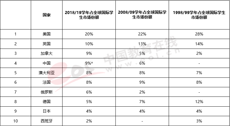 根據美國國際教育協會IEE2020年發布的數據,國際學生分布日趨多元。1998/1999學年世界前五大留學目的國分別是美國、英國、德國、法國和澳大利亞,分別占據了全球國際學生市場的28%、14%、12%、8%、和7%的份額;接下來的二十年里,國際學生的流動越來越多元,雖然美國和英國仍是排名世界第一和第二大的留學目的國,赴美英留學的學生人數也一直在上升,但別的國家增長更快。到了2018/2019學年,美國、英國的留學市場份額分別下降到20%、10%,而中國、加拿大市場份額快速增加到了9%、進入到前五大留學目的國行列;俄羅斯也增長明顯,躋身前十;德國市場份額下降到5%,和法國一起跌出了前五。