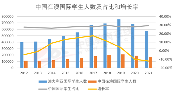 近十年,中國在澳國際學生人數總體呈上升趨勢,受疫情影響,澳大利亞2020年3月開始封鎖邊境,這導致中國赴澳留學人數連續兩年大幅下降,20年降幅達 10%,21年降幅進一步擴大,為12%。