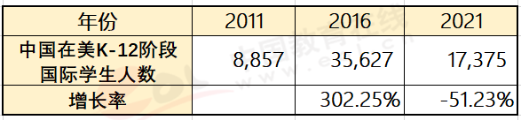 以中國國際學生人數總量最多的美國為例,疫情對低齡留學生的影響最大。根據美國移民和海關執法局 (ICE)發布的2021 年SEVP年度報告數據顯示,從2020年到2021年,在美就讀 K-12 階段的國際學生人數減少了16%。而從2011年到2016年,中國在美就讀K-12階段的國際學生人數增長了302.25%,而到了2021年,相比2016年,小留學生人數下降了一半。