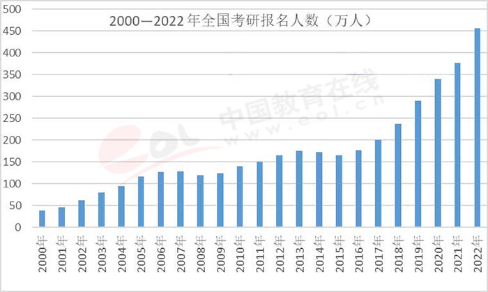 之所以就讀研究生人數再次超過本科生,和中國高校畢業生面臨的國內就業升學壓力有關。當下就業形勢困難,不少大學畢業生選擇升學來延緩就業,考研報名人數迅速增長(見圖19)。2015年,研招報名人數177萬,到2019年,這個人數就接近翻了一番,達到341萬,而到2022年,考研報名人數高達457萬人,而考研招生計劃的增長趕不上報名人數的增長。隨著用人單位在招聘時要求的學歷門檻越來越高,不少學生選擇了出國深造。
