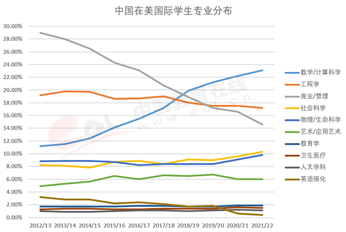 隨著選擇數學與計算科學專業人數的上升,在美就讀STEM類專業的中國國際學生人數也隨之上升,占比從2012/13學年的40.5%上升到2021/22學年的51.6%,漲幅達11%。