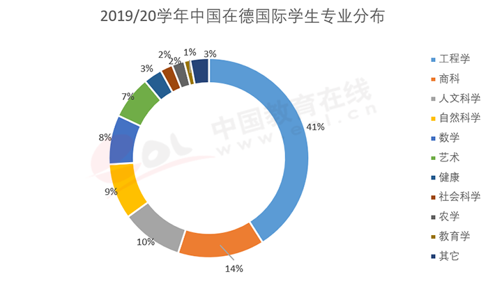 制造業強大的德國,工科是傳統優勢學科,一直受到國際學生的歡迎。在德國的中國國際學生選擇的排名前五的專業是工程學、商科、人文科學、自然科學和數學,位居第一的是工程學,占比41%,加上自然科學、數學與農學,正好為60%;選擇人文科學和社會科學的學生合計約占比為24%,比2016年下降了9個百分點。特別要說一下的是,藝術專業雖然沒能排進前五,但也是中國學生的熱門選擇,占比也呈上升趨勢。