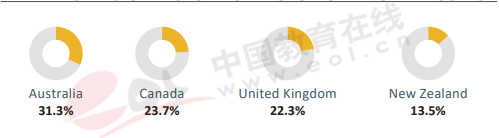 總體而言,美國、英國和澳大利亞等英語國家以及少數歐洲發達國家在吸引國際學生方面仍占據領先優勢。除美國外,排名前十的其它主要英語國家——澳大利亞、加拿大和國的國際學生占本國高等教育學生比例都超過20%,位居全球前,如圖2所示,依次為澳大利亞31.3%,加拿大23.7%,英國22.3%,而另一個英語國家新西蘭則位居第四,國際學生占本國高等教育學生比例為13.5%。