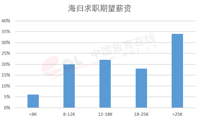 由于中國留學生群體以自費留學為主,在教育階段投入巨大,因此在求職時,對薪金的期望值往往偏高。據領英發布的2022 年《中國留學生歸國求職洞察報告》數據,半數以上的海歸求職者,期望薪金在18000元以上,超過1/3的求職者期望薪金在25000元以上。