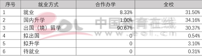 中外合作辦學項目就業統計數據顯著向好,就業率和就業質量持續提升,如表9、表10所示,尤其在出國(境)升學方面具有突出優勢,畢業生多數進入國(境)外一流高校深造。