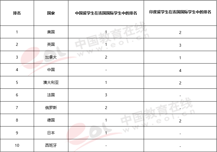 值得一提的是,2018年開始,印度出國留學人數增長非常迅猛,在多個主要留學目的國的國際學生人數已接近中國,在加拿大甚至超過了中國,位居第一。(見表2)。