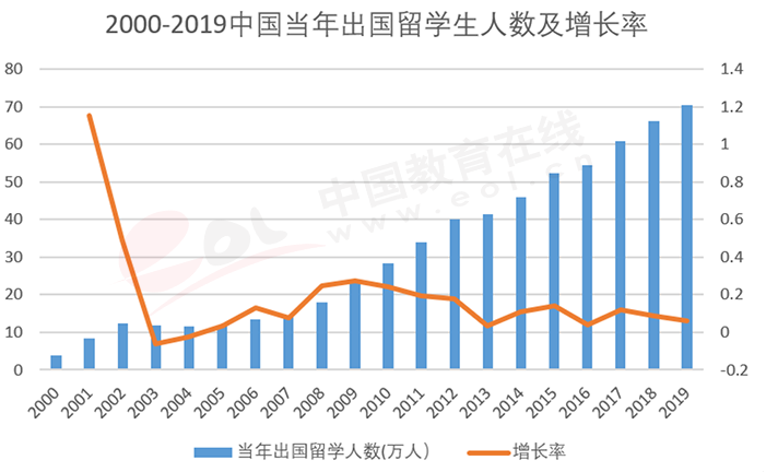中國出國留學人數進入二十一世紀以來,增長迅猛,從2000年的3.9萬人到2019年的70.35萬人,增長了接近18倍,2001-2002年度和2008-2012年度增幅最快,近兩年有所放緩,2019年度增長率為6.25%(見圖5)。