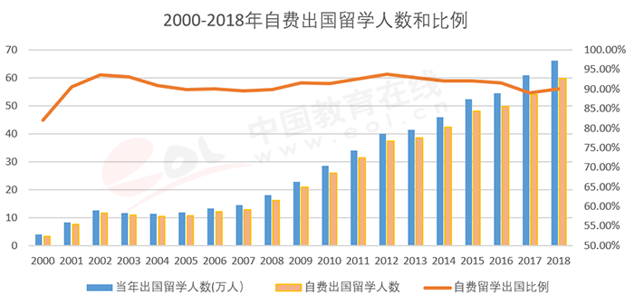 中國出國留學生以自費留學為主,2001年以后,自費出國留學比例都在85%以上,多數年份都超過90%(見圖7)。