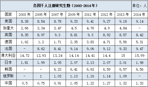 千人注冊研究生即注冊研究生數(我國為在學研究生,單位:人)除以當年全國人口(單位:千人)所得數值。它是反應一國研究生教育規模的重要指標。