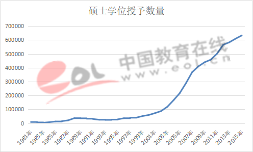 從2005年到2015年,碩士學位授予數量年均增長超過4萬個,2015年授予的碩士學位數量632726個,約為2005年碩士學位授予數量的3倍。