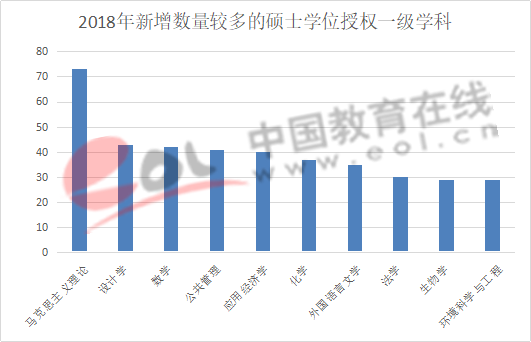 新增的碩士學位授權一級學科中數量最多的為馬克思主義理論,共新增了73個,其次為設計學,增列43個,第三是數學,新增42個。
