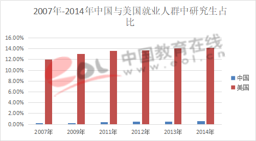 研究生招生規模的增長導致研究生在就業人群中的占比和人數不斷增長。就業人群中研究生占比則反映了研究生教育對經濟社會發展所需的高學歷的貢獻程度。據統計,2007年至2014年我國就業人群中研究生占比從0.2%上升到0.55%。同比美國在2007年至2014年間就業人群中的研究生占比,中國的研究生占比雖然有一定增長,但遠遠小于美國 。從這一角度看,我國研究生教育仍有較大的發展空間。