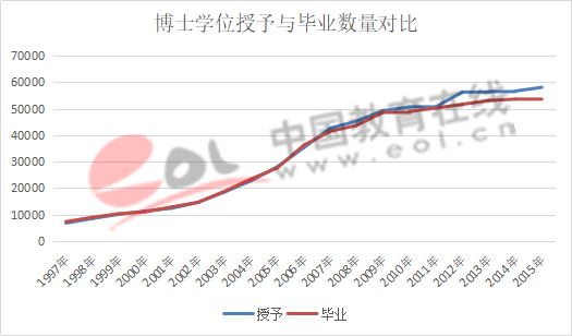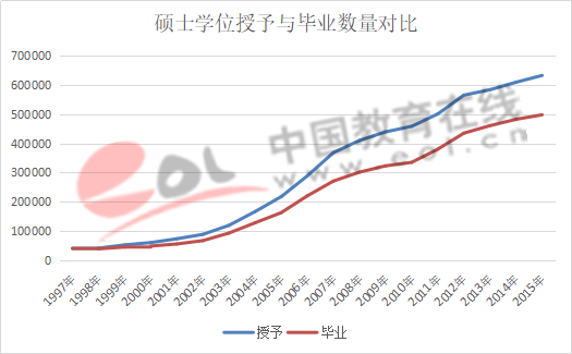 從1997年至2015年碩士學位授予數量大于畢業生數量,并且差距逐漸拉大。2015年碩士學位授予數量632726個,比畢業生數量多了134982個。主要原因是在職研究生數量的增長,隨著非全日制納入統考,規范了非全日制招生,未來這一差距會逐漸縮小。