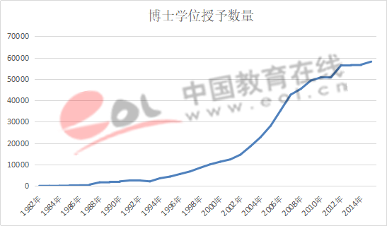 1982年我國授予第一批博士學位。從1994年開始,博士學位授予規模也呈現急劇擴大的趨勢,到2015年授予博士學位總量超過66萬人。從1994年至2007年間,博士學位授予數量以年均25%左右的幅度快速增長,其后博士學位授予數量增長速度放緩,2008年至2015年間年均增幅約4%。