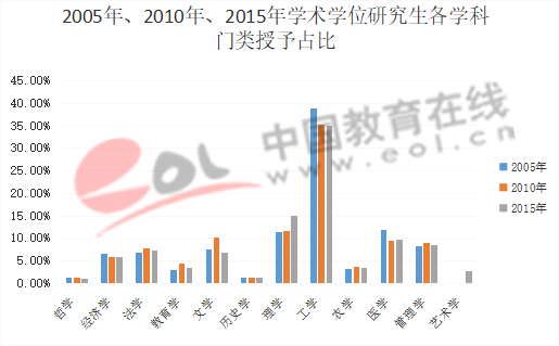 2005年至2015年的數據顯示,工學在各學科門類學術學位研究生授予中授予人數最多,占比35%。其次則是理學,所占比例在2015年上升至15%。