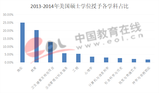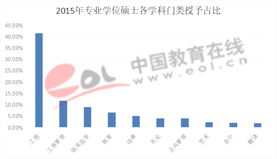 2015年全國專業學位碩士授予數量312201個,各學科門類授予人數前10名的依次是工程、工商管理、臨床醫學、教育、法律、農業、公共管理、藝術、會計和翻譯。其中工程專業授予人數最多,所占比例41.5%,第二則是工商管理,占專業學位授予總量的11.8%。