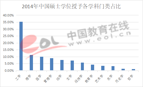 2014年我國碩士學位授予學科人數較多的為工學,占比約35%,其次是理學,占12%,第三位醫學,占比10%。