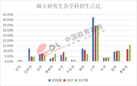 從歷史數據來看,工學、理學占比呈下降趨勢,在2000年工學占比42.5%,到2017年下降了近8個百分點。理學在2000年占比12.38%,到2017年下降了近5個百分點,僅占7.28%。而教育學、管理學比例上升最大,教育學從2000年2.7%上升至7.4%,管理學從2007年11.96%上升至16.09%。