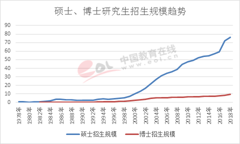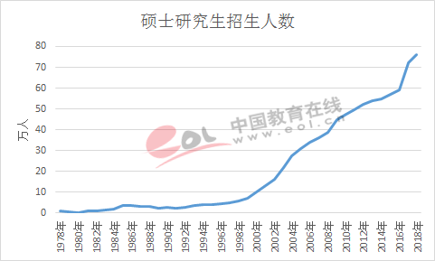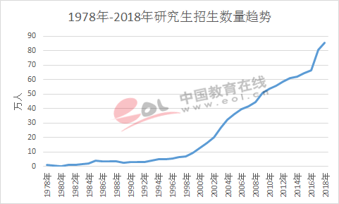 研究生招生人數在逐年上升,在1978年,研究生招生10708人,到2018年招生數量達到85.8萬人,40年間,招生數量增加了80倍。