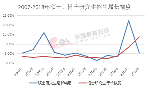 2007年以來的近十年里,碩士、博士研究生招生每年的增長率大多維持在4%左右,2018年碩士招生增幅為5.6%,博士招生增幅為13.8%。