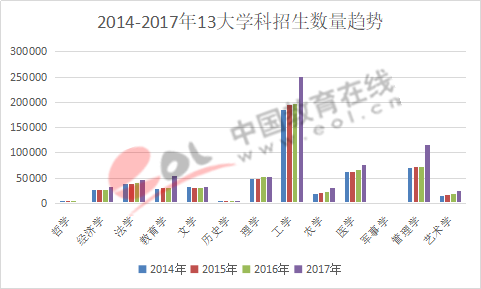 從各學科招生情況看,工學、管理學、醫學占比最高,在2017年招生數量達到25萬、11.6萬、7.5萬人,占比分別達到34.6%、16.09%、10.4%。