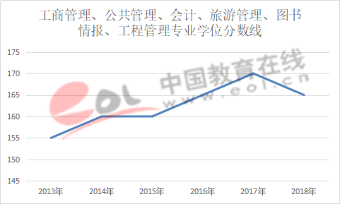 管理類專業學位碩士錄取分數線在報名熱度逐年增加的趨勢下,呈上升趨勢。