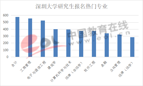 深圳大學報名人數最多的前十個專業中,管理類占3個,工學占4個,其中計算機類相關專業較多。法學類占2個。熱門專業中,報名人數最多是會計專業,達到578人,錄取96人,報錄比為6:1。