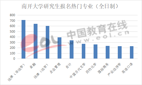 上述高校熱門專業中,統計包含非全日制專業,人數較多的一般是工商管理。南開大學全日制專業報名人數最多的為法律(非法學)、金融和法律(法學)、企業管理、會計和中國古代文學專業。