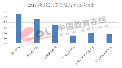 2018年浙江大學各院系的碩士研究生報錄比中,經濟學院報錄比11.3:1,光華法學院報錄比9.3:1,公共管理學院報錄比7.2:1,而能源工程學系、信息與電子工程學系、光電信息工程學系報錄比僅為3:1、3.9:1、3.3:1。