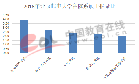 2018年北京郵電大學各院系的碩士研究生報錄比中,經濟管理學院報錄比3.9:1,電子工程學院報錄比2.7:1,人文學院和自動化學院報錄比都是2.3:1,信息與通信工程學院報錄比僅2.1:1。