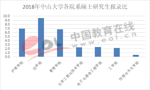 2018年中山大學各院系的碩士研究生報錄比中,護理學院報錄比為6.9:1、法學院報錄比為9.5:1,管理學院(不含MBA)報錄比為6.8:1,而化學工程與技術學院、電子與通信工程學院、工學院僅為2.4:1、2.4:1、2.2:1,物理與天文學院報名22人,錄取45人,報錄比0.5:1。
