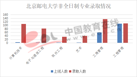 北京郵電大學非全日制專業中,大量專業的錄取人數遠遠超過上線人數,說明招生基本上靠調劑來完成。其中計算機科學技術專業,上線4人,錄取108人,電子與通信工程上線3人,錄取82人,軟件工程上線2人,錄取35人。管理類專業情況有所好轉,工商管理專業上線59人,錄取135人,工程管理上線109,錄取111人,基本持平。